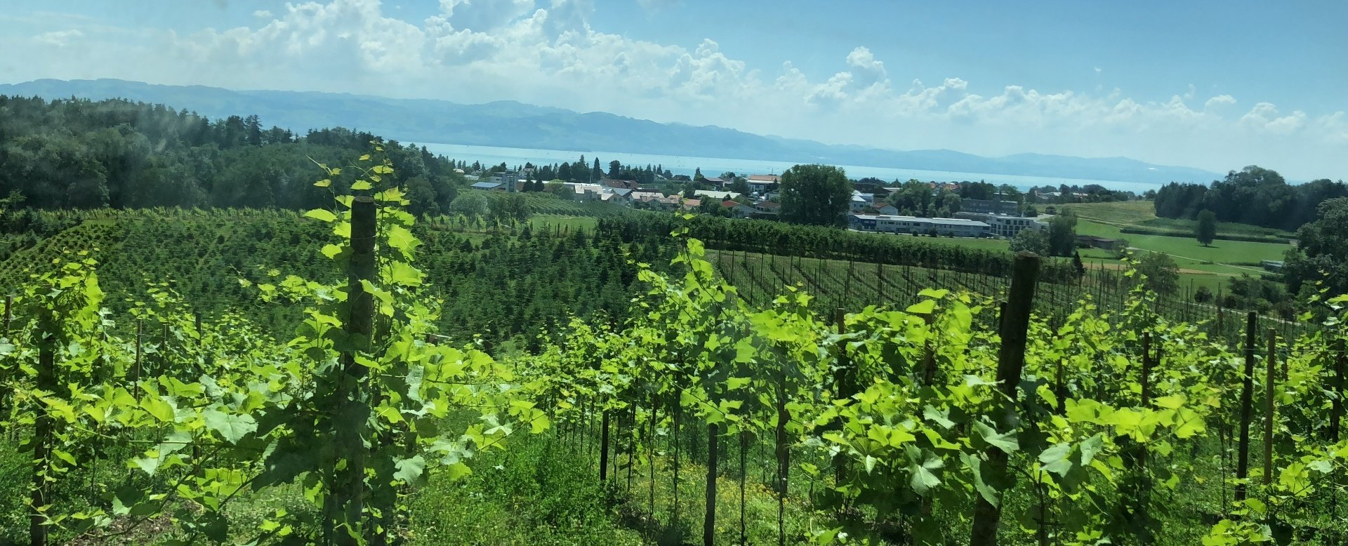 Im Weinberg mit Südhang und dem herrlichen Blick auf den Bodensee und die Schweizer und Österreichischen Berge bauen wir überwiegend pilzwiderstandsfähige Rebsorten im ökologischen Anbau an.